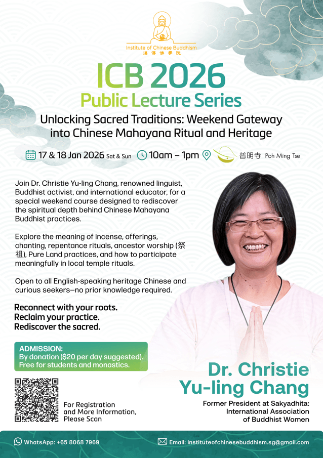 The Institute of Chinese Buddhism (ICB) warmly invites you to join the first of our ICB 2026 Public Lecture Series with Dr. Christie Yu-ling Chang, former President at Sakyadhita: International Association of Buddhist Women.