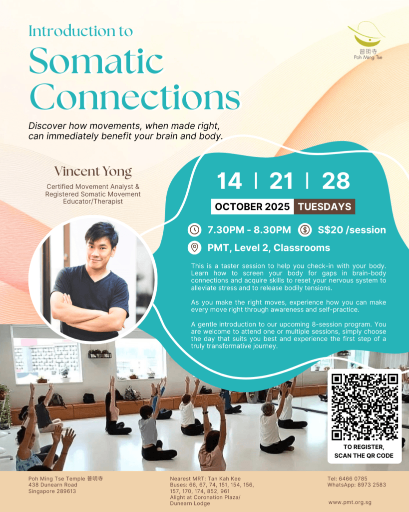 You're warmly invited to Introduction to Somatic Connections β a transformative taster session led by Vincent Yong, Certified Movement Analyst & Registered Somatic Movement Educator/Therapist.