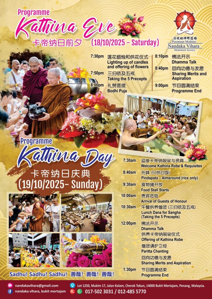 • Welcome Kathina robe & requisites, Alms round (Pindapata), Food stalls, GOH arrival, Lunch dana / Taking the 5 precepts, Dhamma talk, Kathina robe offering, Paritta chanting, Sharing merits and aspiration