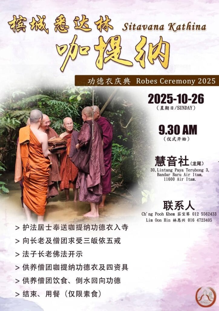 - Kathina robe offering, Taking the 5 precepts, Dhamma talk, Offering of robes & requisites, Sanghika dana, Sharing of merits, Vegetarian lunch for devotees