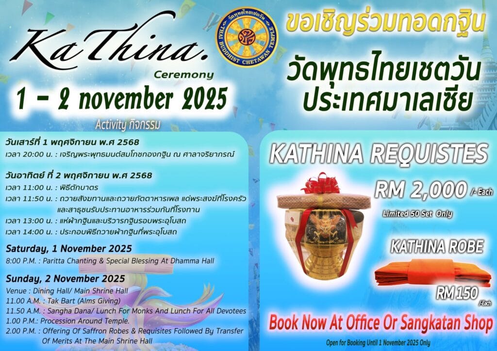 • Alms round, Sangha dana / Lunch for monks and Lunch for devotees, Procession around temple, Offering of robes & requisites, Sharing of merits at the Main Shrine Hall